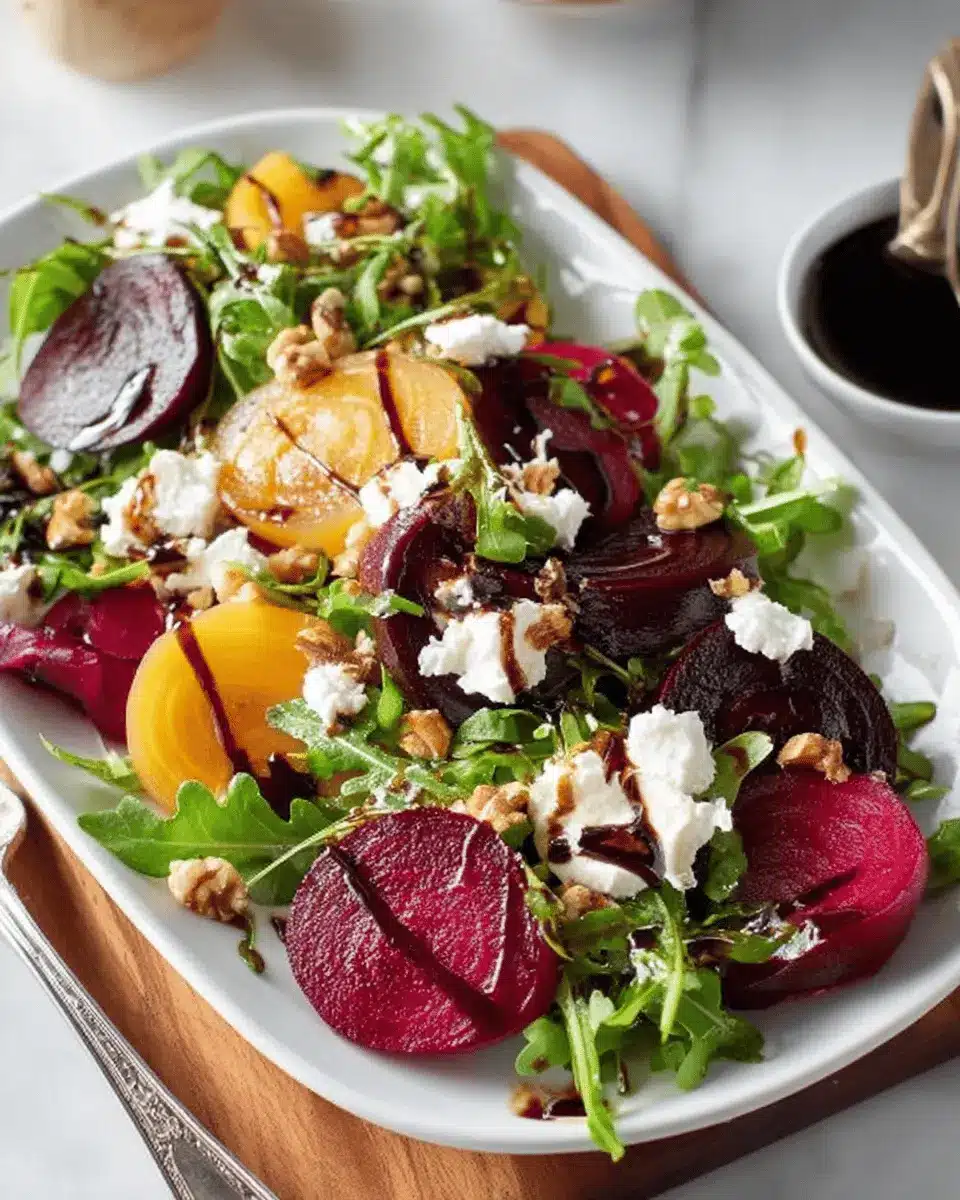 Impress your guests by presenting the beet salad with goat cheese and balsamic on individual plates or in elegant glassware for a beautiful layered effect. Add edible flowers or microgreens for a pop of color and flair. Alternatively, you can create a salad bar where guests can customize their own salads with extra toppings like roasted chickpeas or sliced avocados. It also makes a fantastic appetizer when served in mini portions, opening the door for more creative culinary explorations!