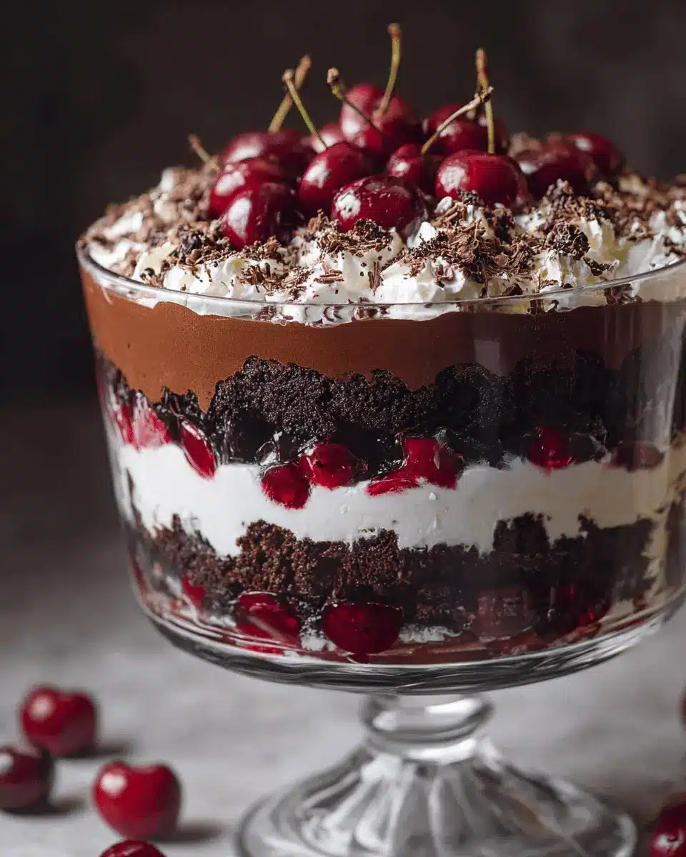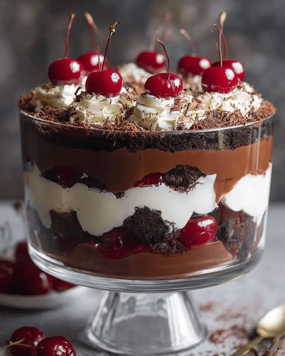 Preparing your Black Forest Trifle in advance is a great idea, especially for gatherings! You can assemble the trifle a day before serving. Simply layer all the components as instructed and cover it tightly with plastic wrap. The flavors intensify when allowed to chill overnight. Just remember to add any garnishes, like fresh cherries and chocolate sprinkles, right before serving for that extra touch!