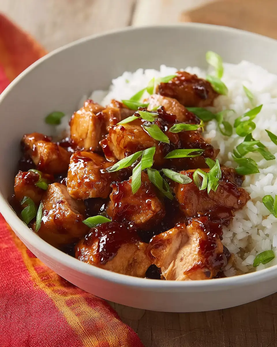 Once everything is beautifully combined, serve your bourbon chicken over a bed of fluffy, cooked rice. Don’t forget to sprinkle some fresh, sliced green onions on top; they add a delightful crunch and fresh flavor that complements the dish perfectly.