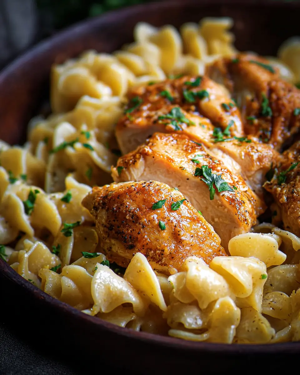 Finally, it’s time to bring Chicken and Buttered Noodles to life! To the pot of garlic butter sauce, add the drained noodles and ¼ cup of parmesan cheese. Toss everything together gently; if it seems a bit dry, you can add a little more reserved pasta water to reach your desired consistency. Plate the buttery noodles and top them with your perfectly cooked chicken. Garnish with fresh parsley and extra parmesan if desired. Enjoy your heartwarming meal!