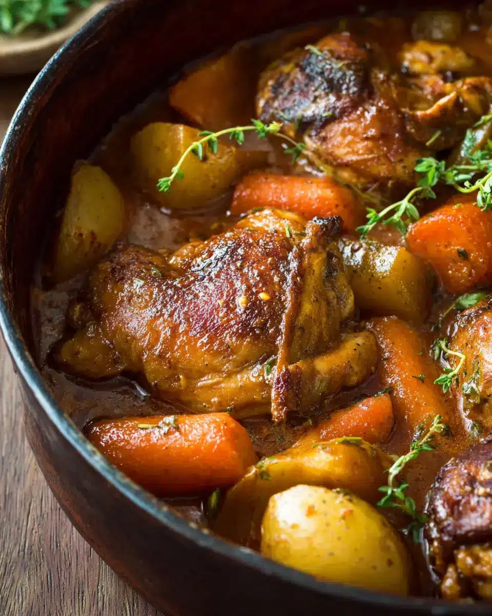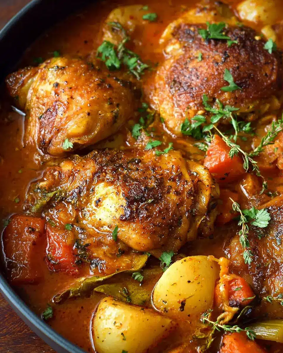 Once that time has passed, your chicken stew is nearly ready! Check the sauce, adjusting the seasoning with salt and pepper to taste. For that perfect presentation, consider garnishing with fresh thyme or parsley. Serve it up alongside some warm crusty bread for dunking into that rich, savory sauce—it’s the ideal way to round off your meal.