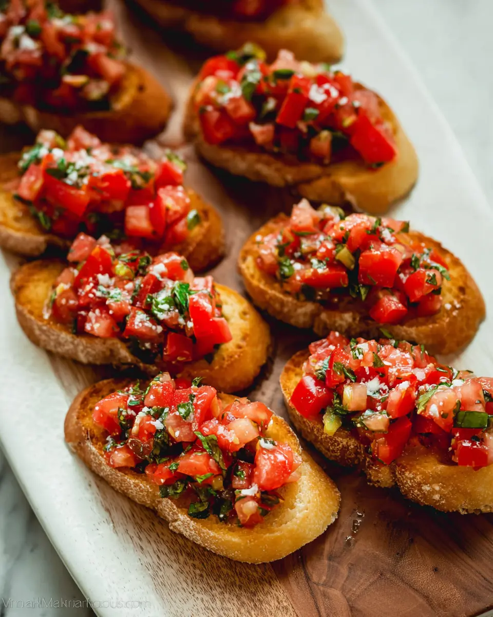 Classic bruschetta is a simple yet flavorful Italian appetizer that has won the hearts of many. It consists of toasted bread topped with a vibrant mixture of fresh tomatoes, basil, garlic, and a drizzle of olive oil. What makes it an irresistible choice for gatherings is its delightful balance of crunchy and juicy textures along with its fresh, bright flavors.