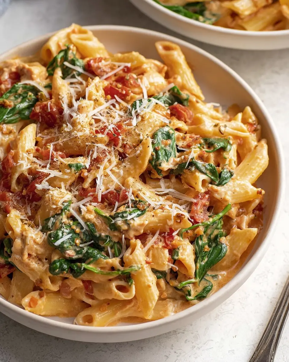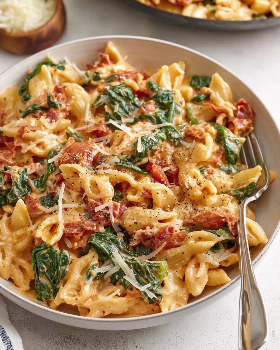 Absolutely! To transform your creamy tomato and spinach pasta into a vegan-friendly option, simply replace the cream cheese with a plant-based cream cheese alternative or even blended silken tofu for a silky texture. For the Parmesan cheese, nutritional yeast is a fantastic substitute that adds a cheesy flavor without the dairy.