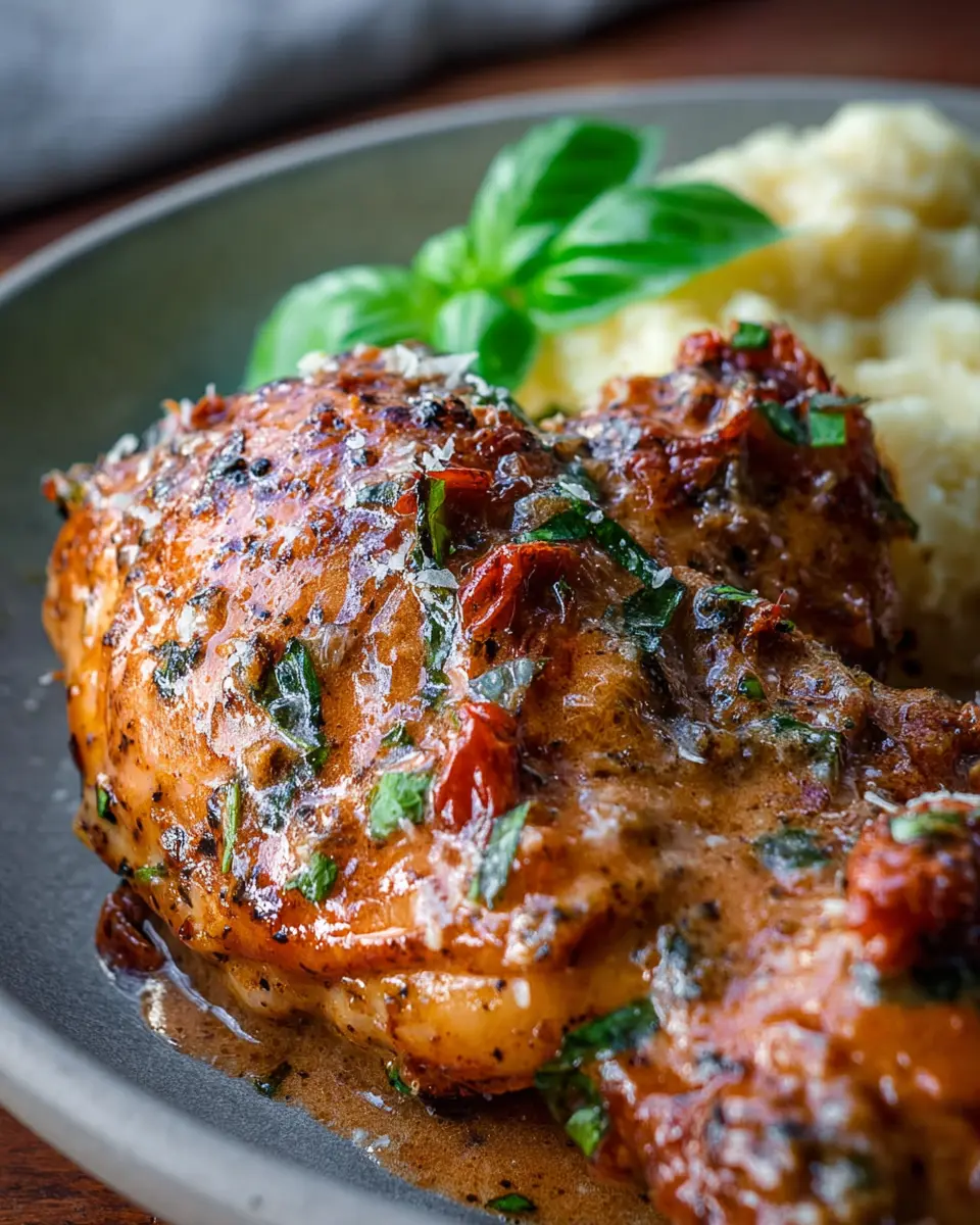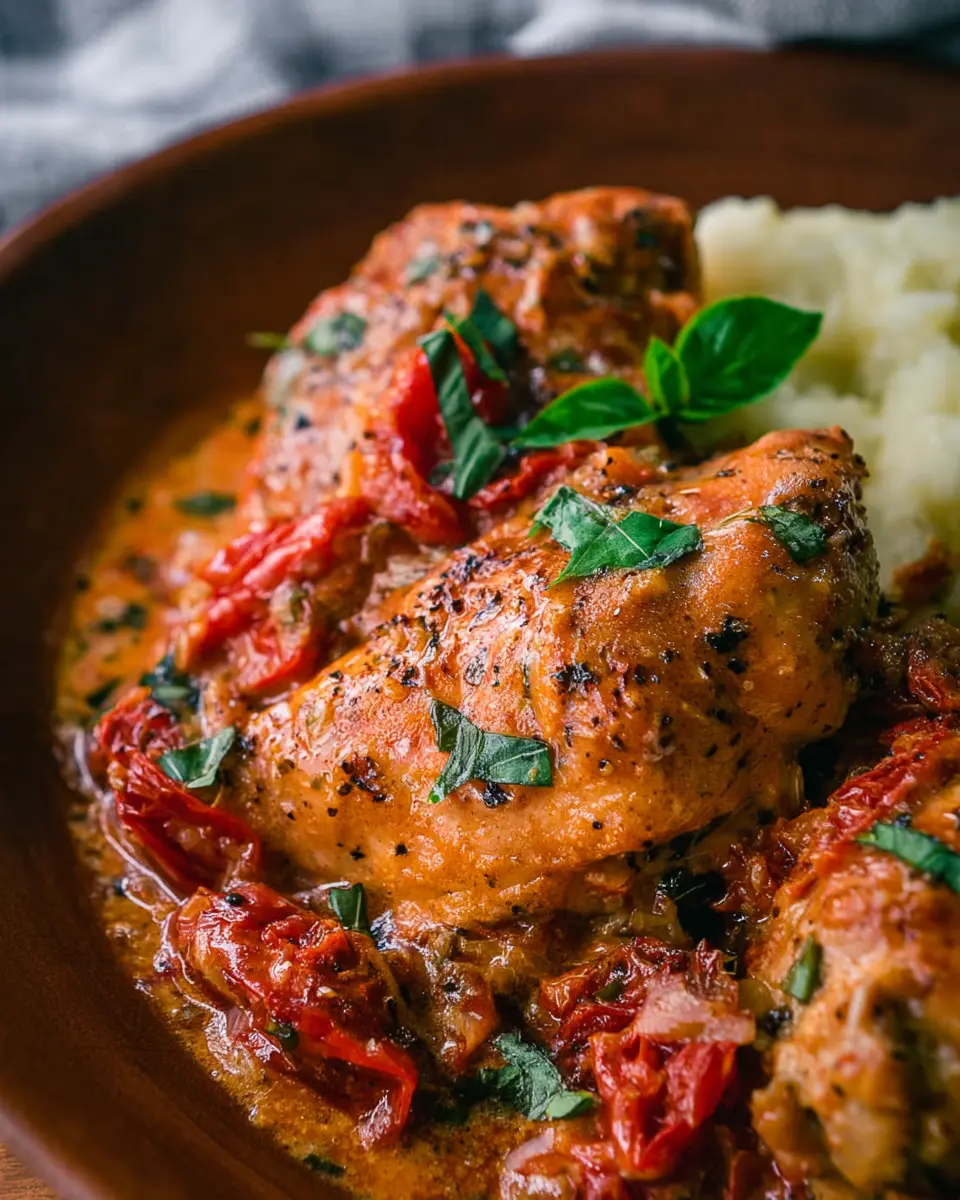 - In a bowl, whisk together chicken broth, heavy cream, sun-dried tomatoes, garlic, thyme or oregano, and cornstarch. Pour the mixture over the chicken.