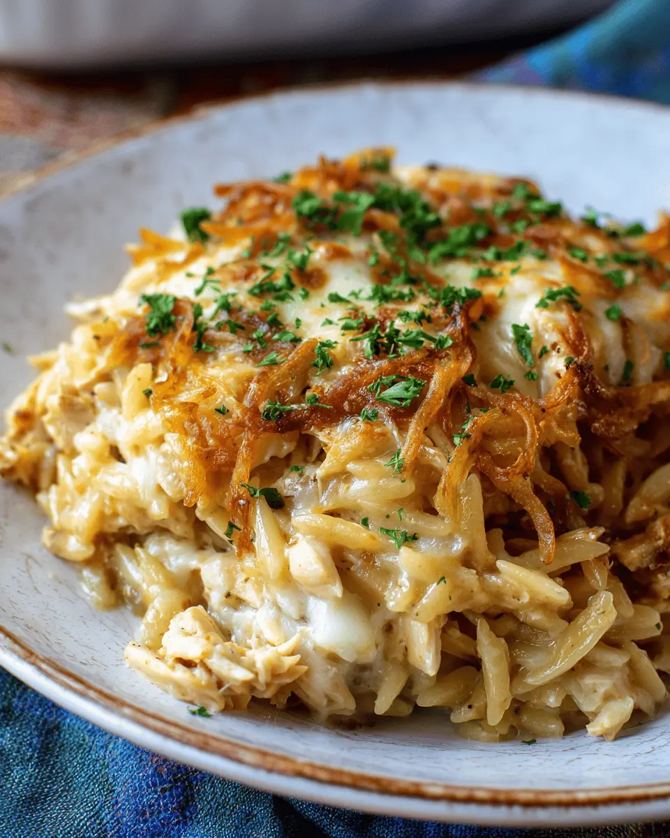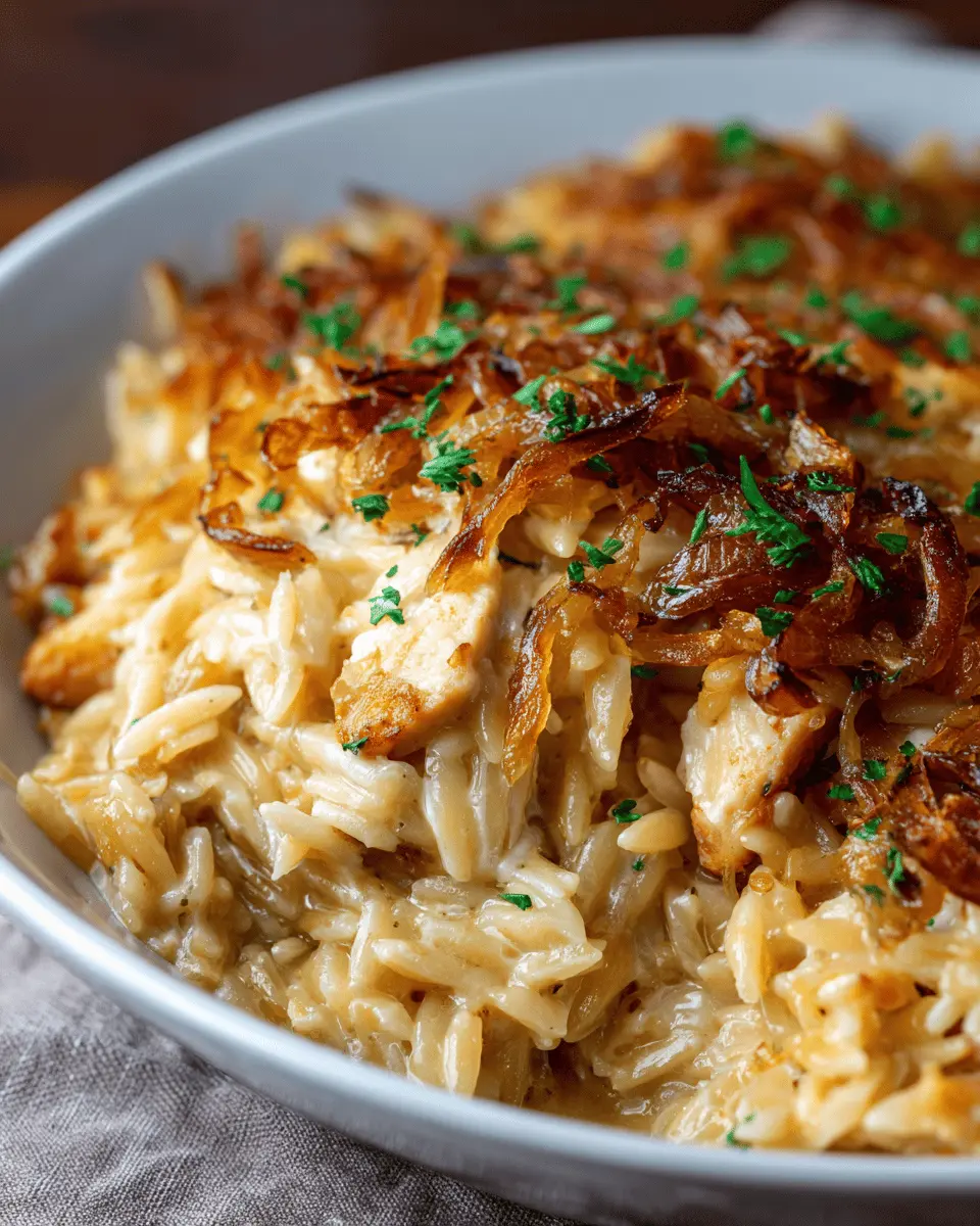 Plus, the beauty of this French Onion Chicken Orzo Casserole lies in its versatility. You can easily customize ingredients, making it a great option for different tastes or dietary preferences. Did you know that casseroles can often be made in advance, saving precious time for those who lead busy lives?