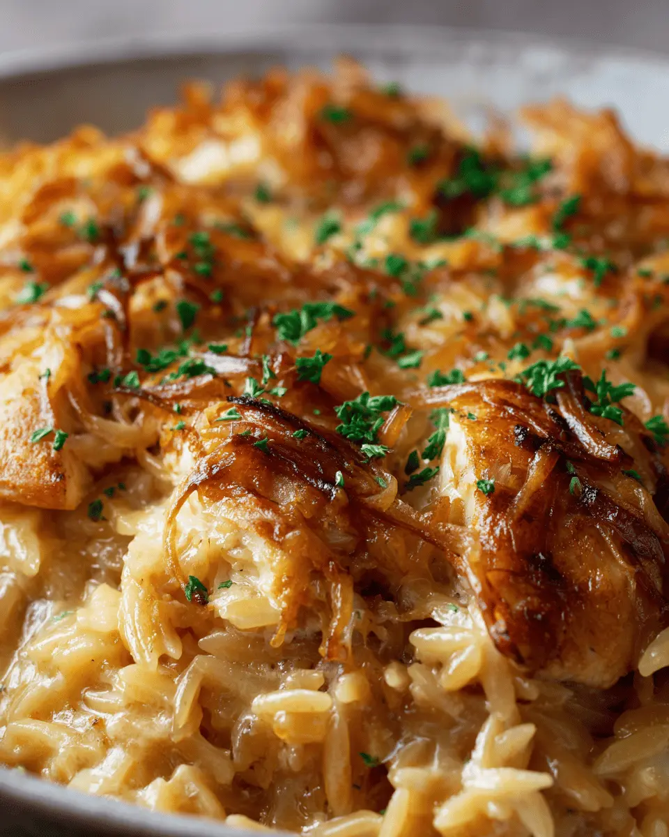 Step-by-step preparation of French Onion Chicken Orzo Casserole