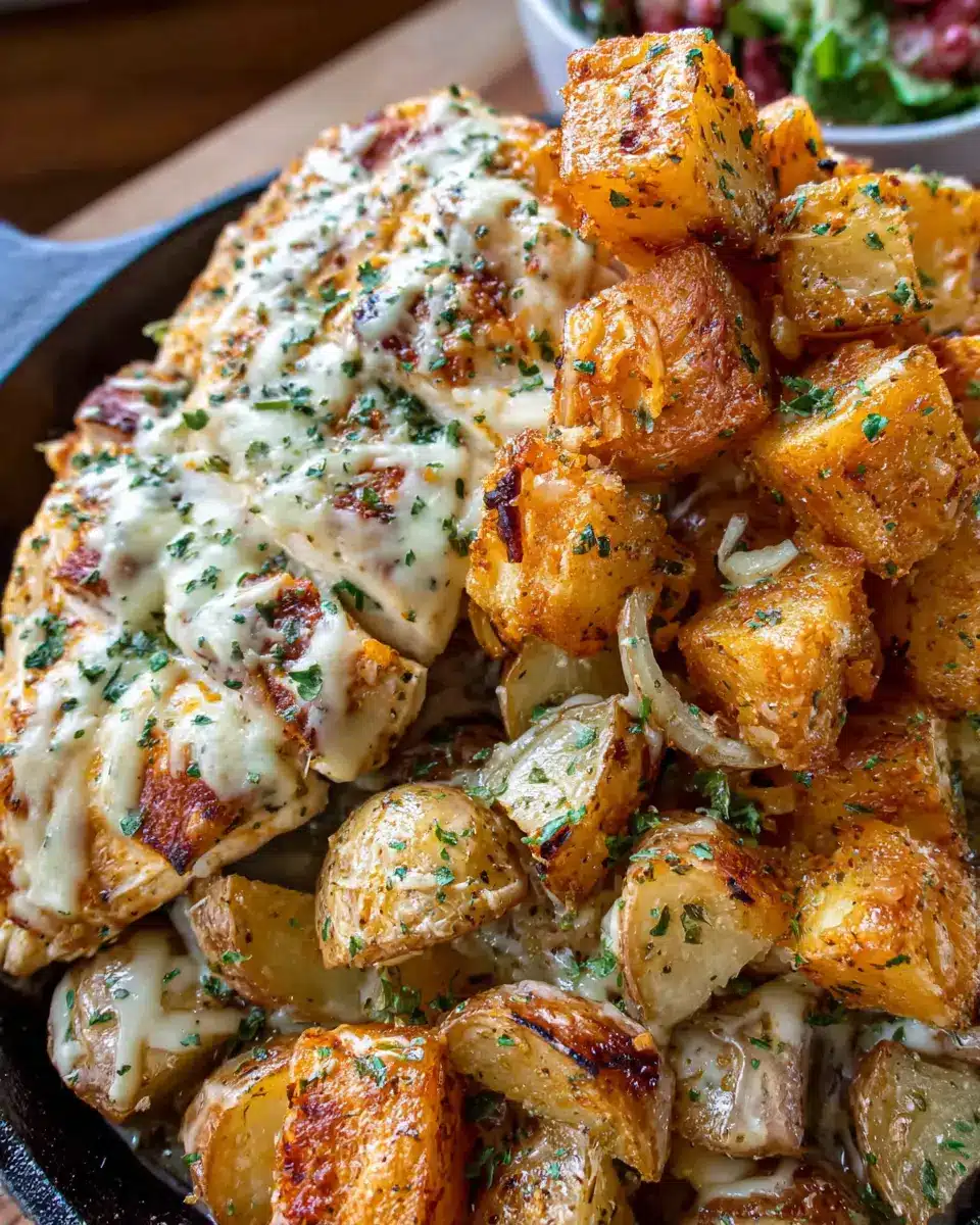 Now that everything is cooked, add the crispy potatoes from the air fryer directly into the skillet with the chicken. Give it a good stir, ensuring everything is mixed well. Next, sprinkle about 1 cup of shredded mozzarella cheese on top. For an extra cheesy finish, fan that cheese out to cover as much surface area as possible. Broil it in the oven for just a few minutes until the cheese is melted and bubbly. Alternatively, you can cover the skillet with a lid and let it sit on the stove for a few minutes. Serve it hot, and if you’re feeling adventurous, drizzle a bit more garlic Parmesan sauce over it before taking a bite!