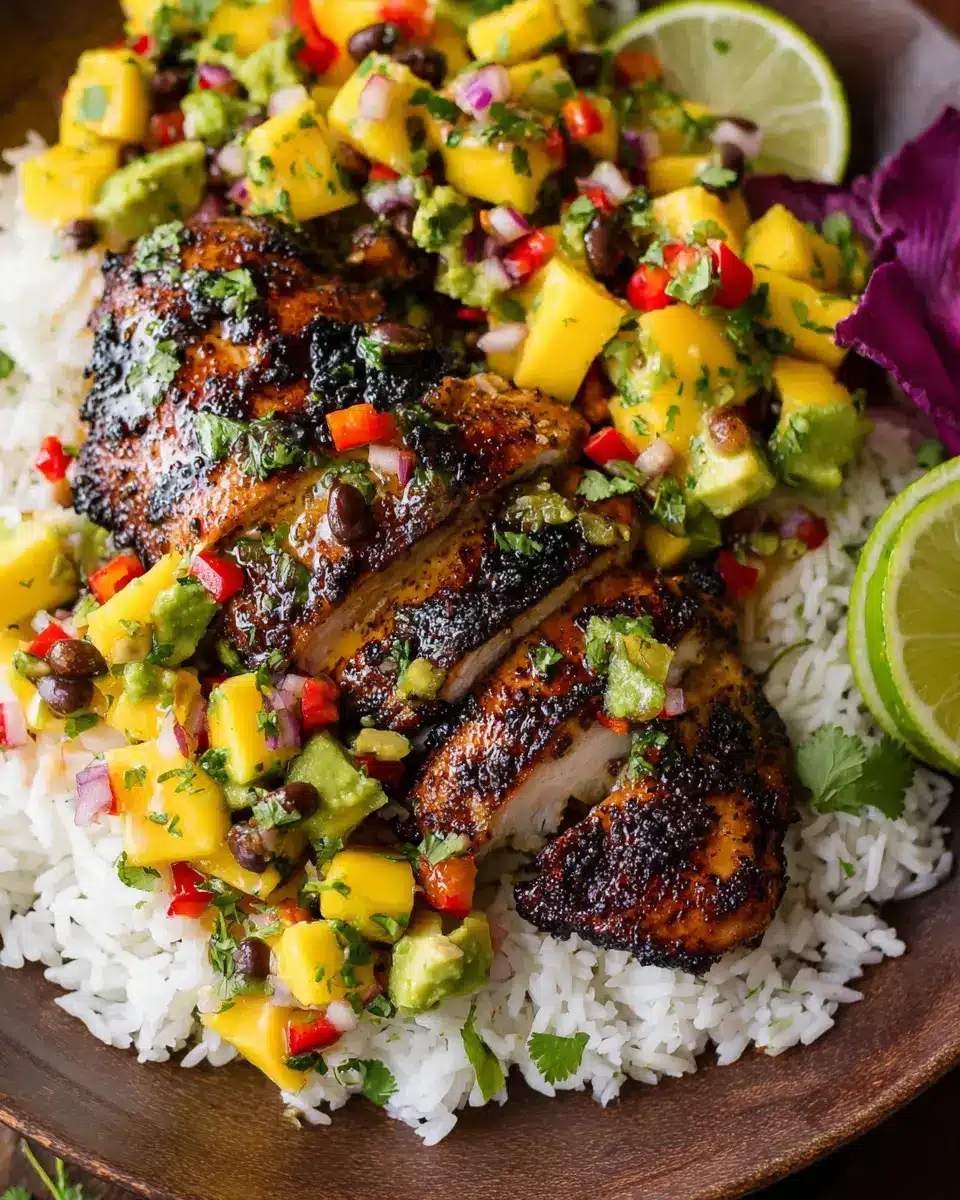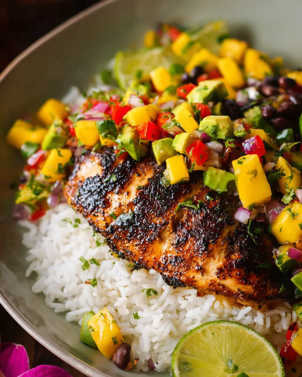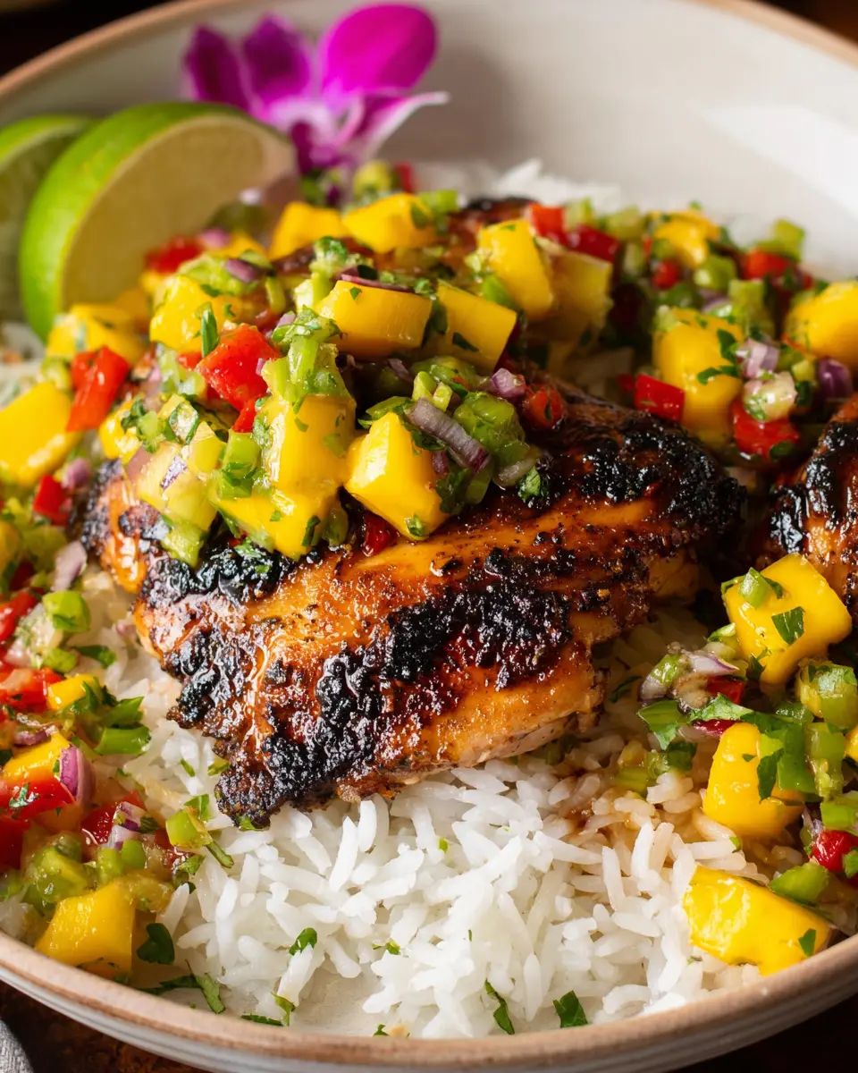 Jerk Chicken with Mango Avocado Salsa and Coconut Rice
