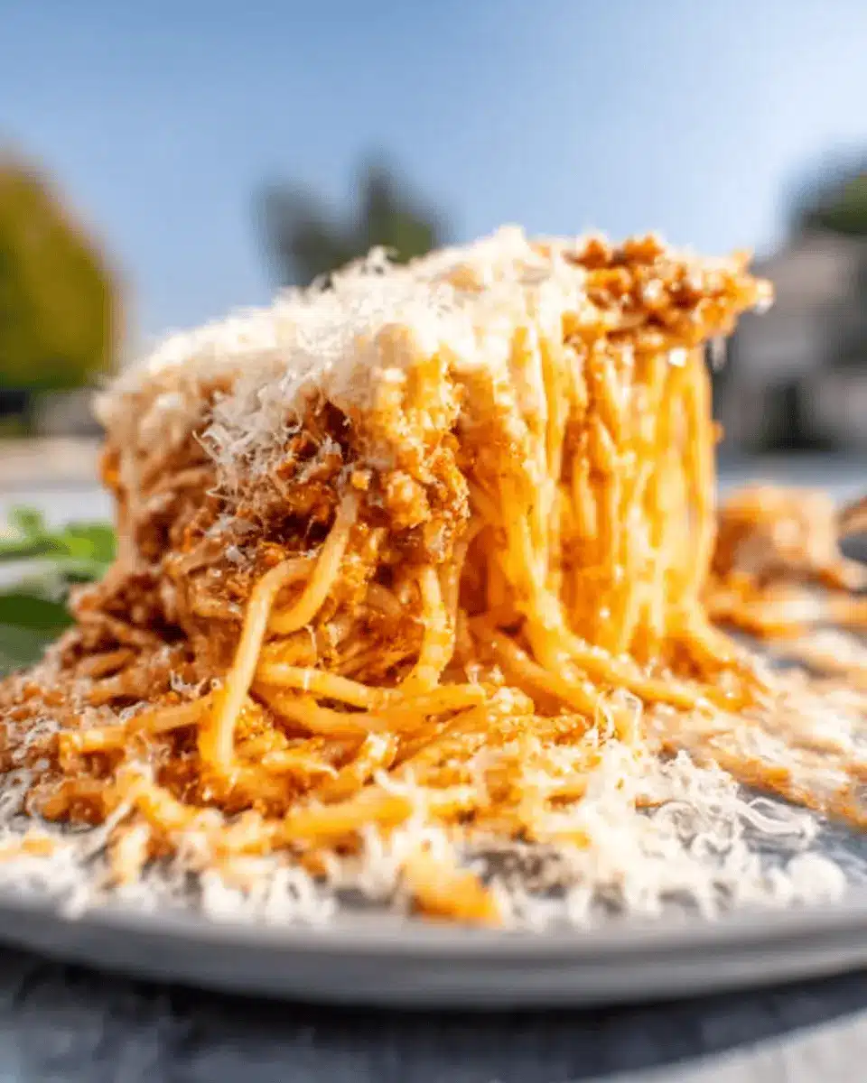 While your meat sauce is simmering, let's get those spaghetti noodles ready! Boil a large pot of salted water and cook 16 ounces of spaghetti according to the package instructions—aim for that perfect al dente texture. Once ready, drain and immediately transfer the hot spaghetti into a large mixing bowl. Toss it with 3 tablespoons of butter and the reserved ½ cup marinara sauce until it’s evenly coated and buttery.