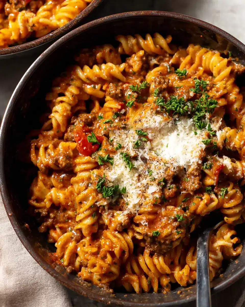 One pot creamy tomato beef pasta
