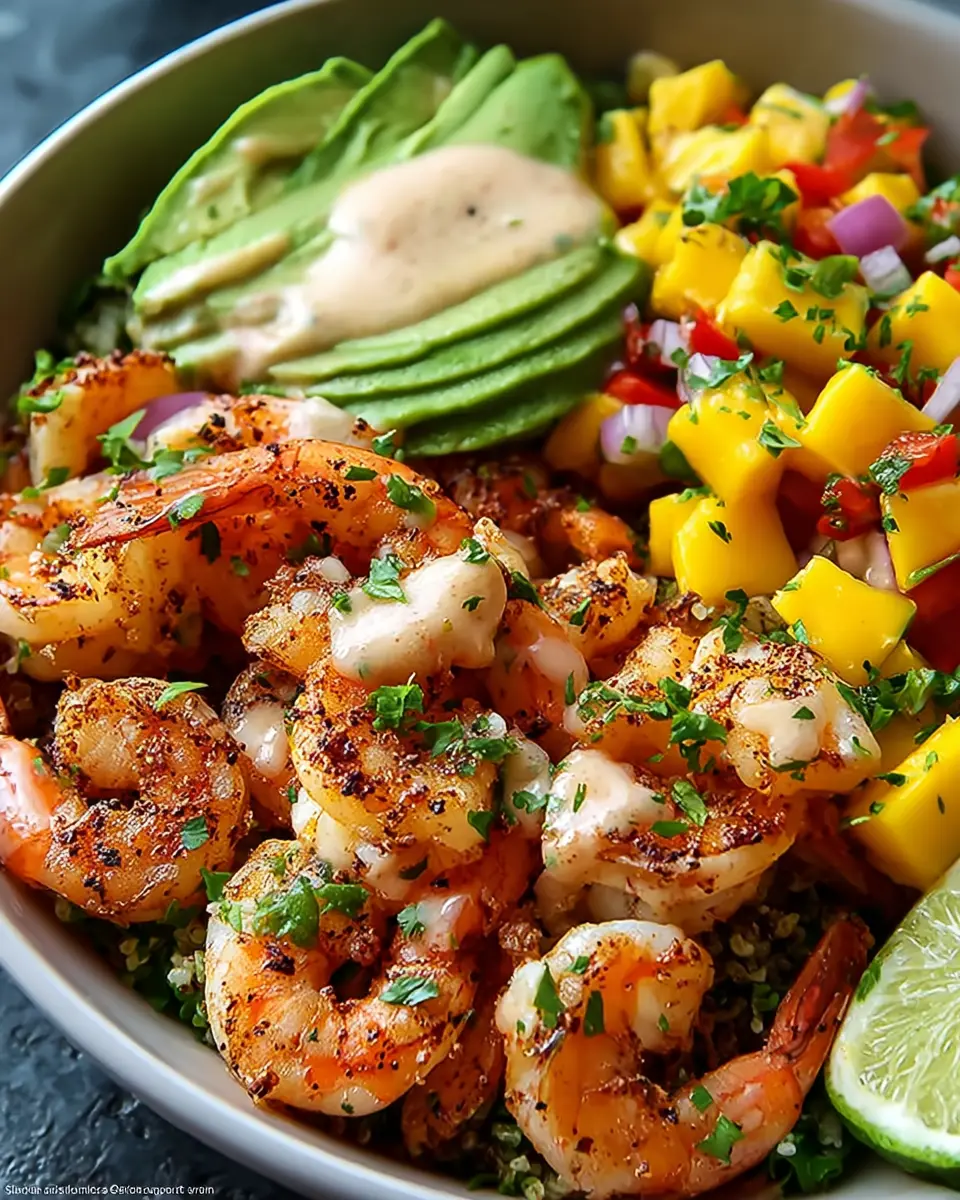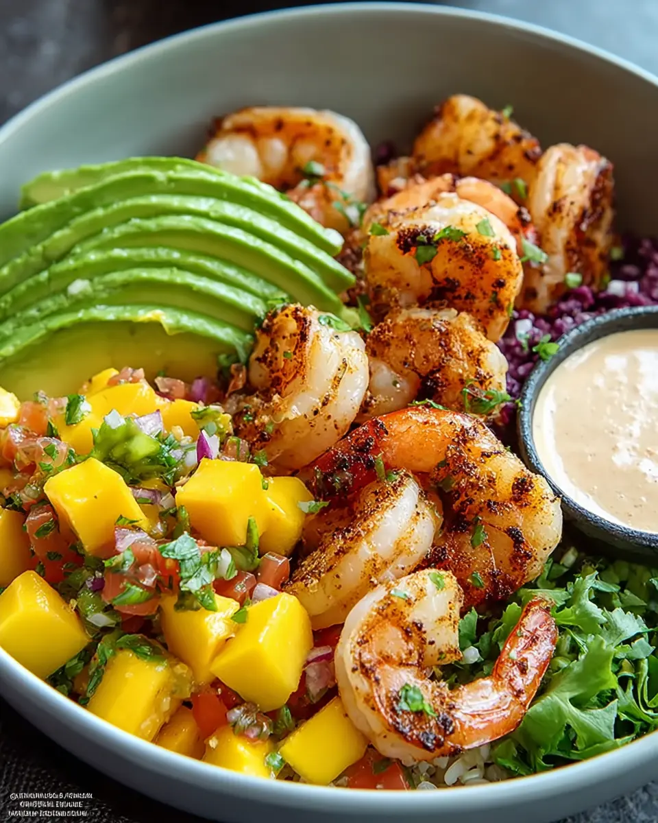 - Assemble by layering rice or quinoa, avocados, shrimp, and topping with mango salsa.