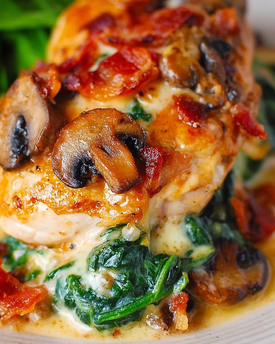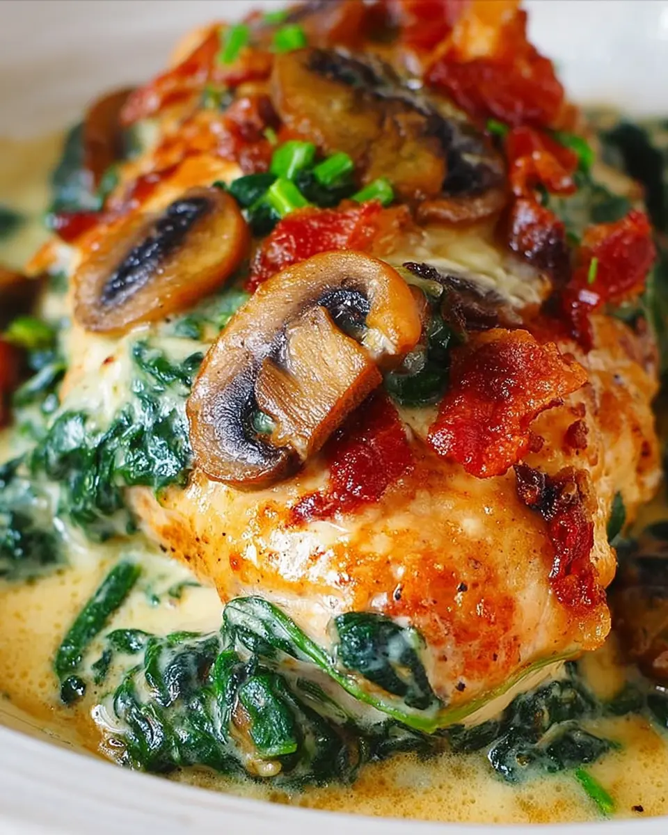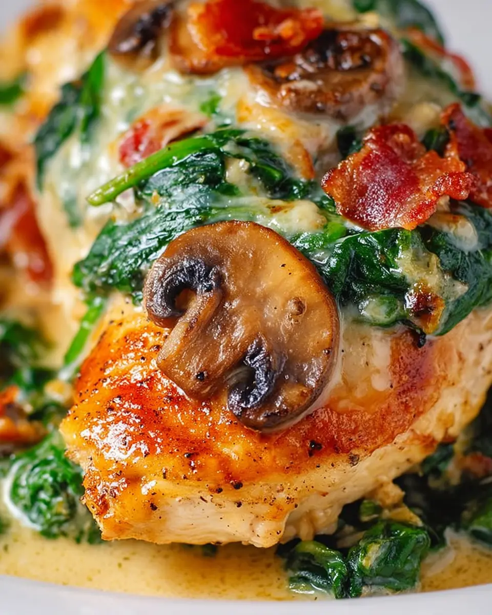 Smothered Chicken with Creamed Spinach, Bacon, Mushrooms