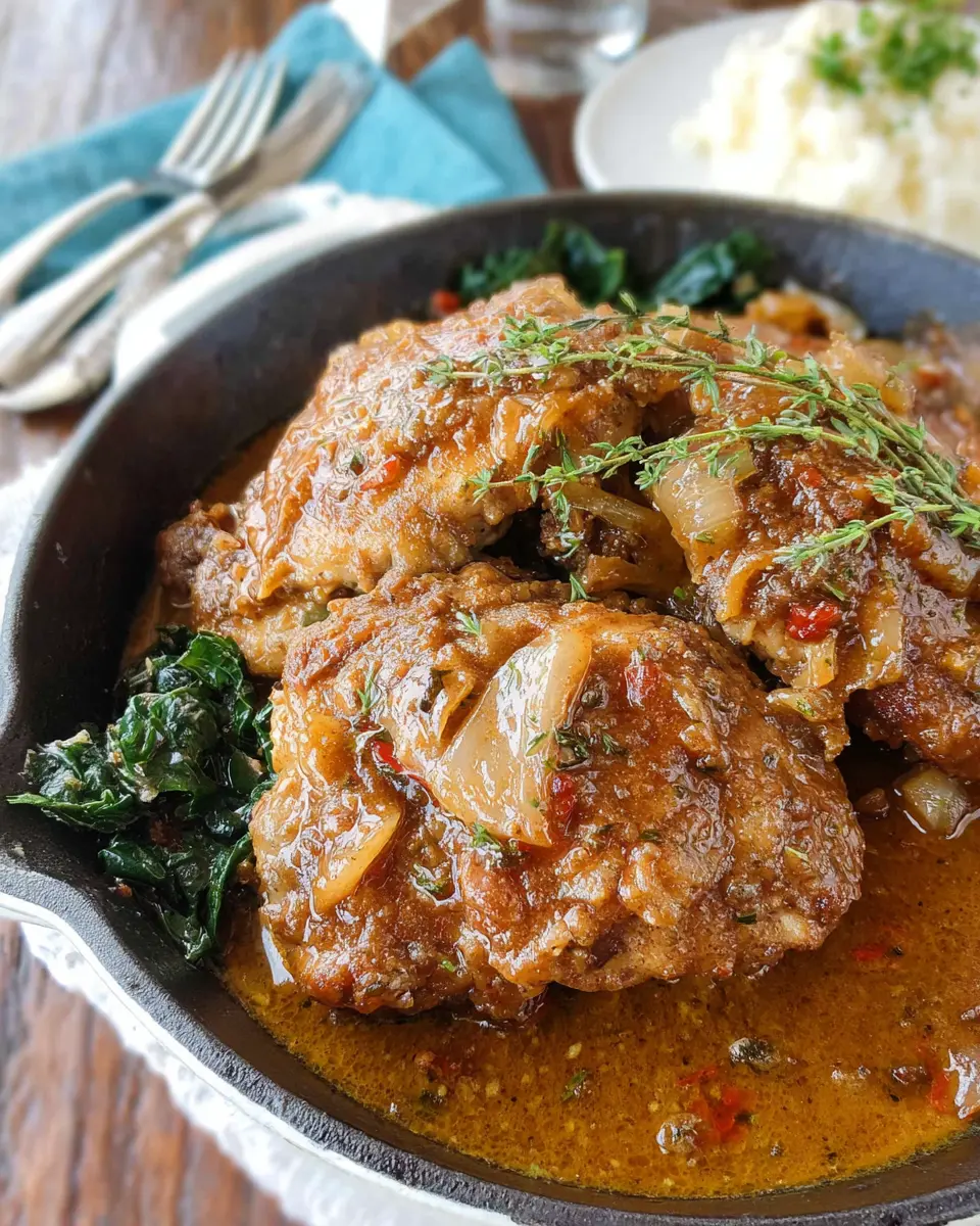 Opting for bone-in chicken thighs means you're harnessing the beauty of tender, juicy meat that won’t dry out. The bones not only add depth to the flavor but also contribute to a richer sauce. This is comfort food at its finest, with each ingredient working in harmony to create an unforgettable meal.