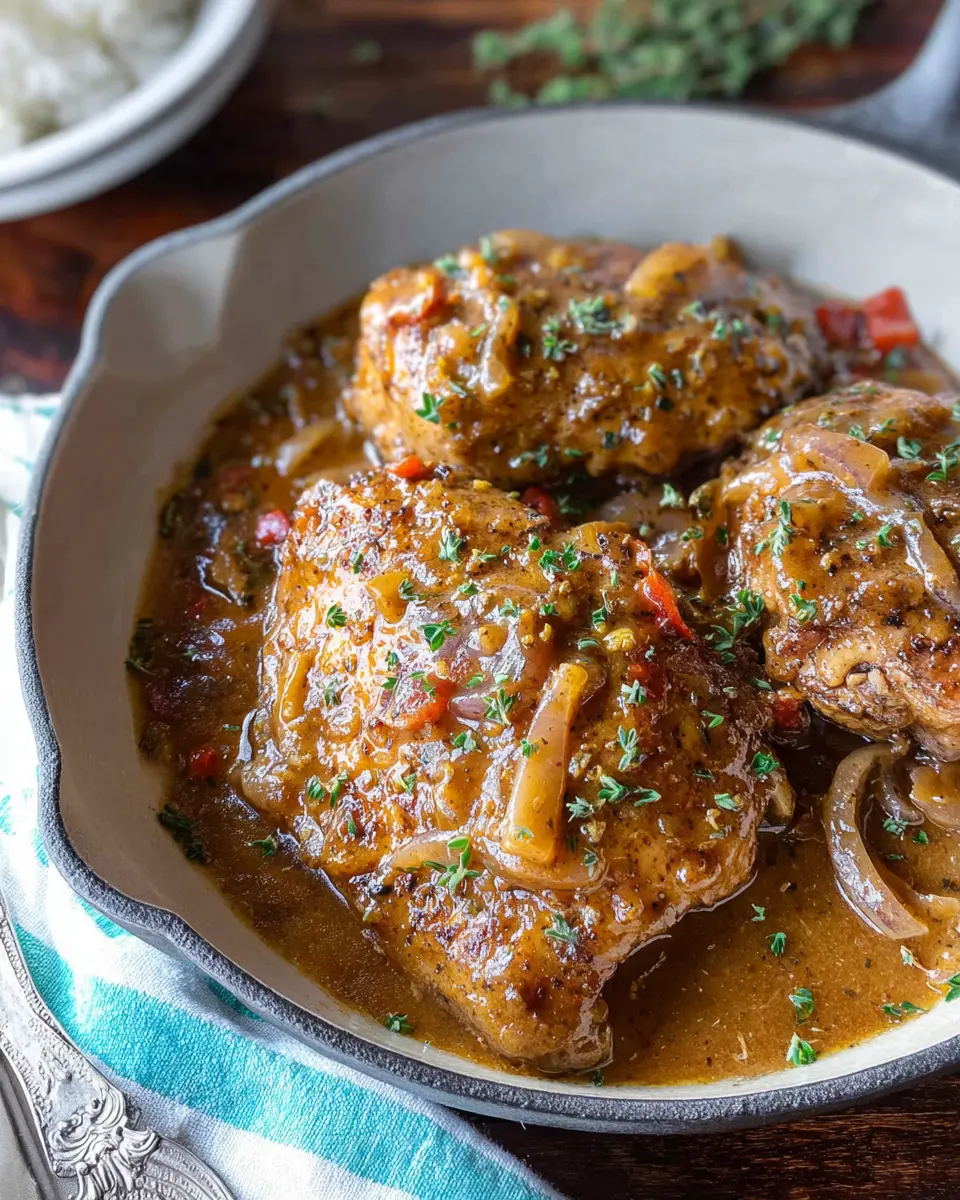 Return the chicken to the skillet, spooning the gravy over it. Pop your skillet in the oven set to 350°F and let it bake for about 35 to 40 minutes. This slow cooking allows the chicken to soak up all that beautiful gravy, ensuring it comes out tender and full of flavor. After letting it rest for around 10 minutes, serve over white rice for a classic presentation.