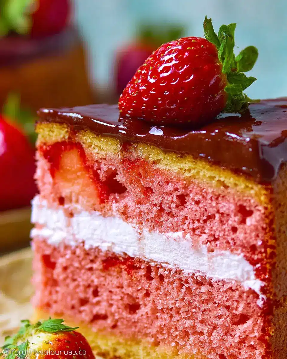 Finally, pour the cooled ganache over the cake, letting it drizzle down the sides. Top with fresh strawberries to enhance that summer vibe! Your strawberry sponge cake is now ready to be served—enjoy the compliments that follow!