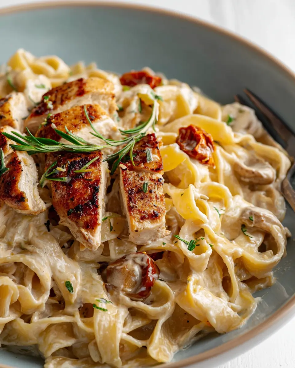 To finish, slice the chicken and serve it either on top of or tossed through the pasta. For an extra touch, sprinkle some grated lemon zest and additional rosemary leaves for a pop of freshness. Enjoy your delicious creamy chicken pasta with a side salad or some crusty bread to soak up that flavorful sauce. Bon appétit!